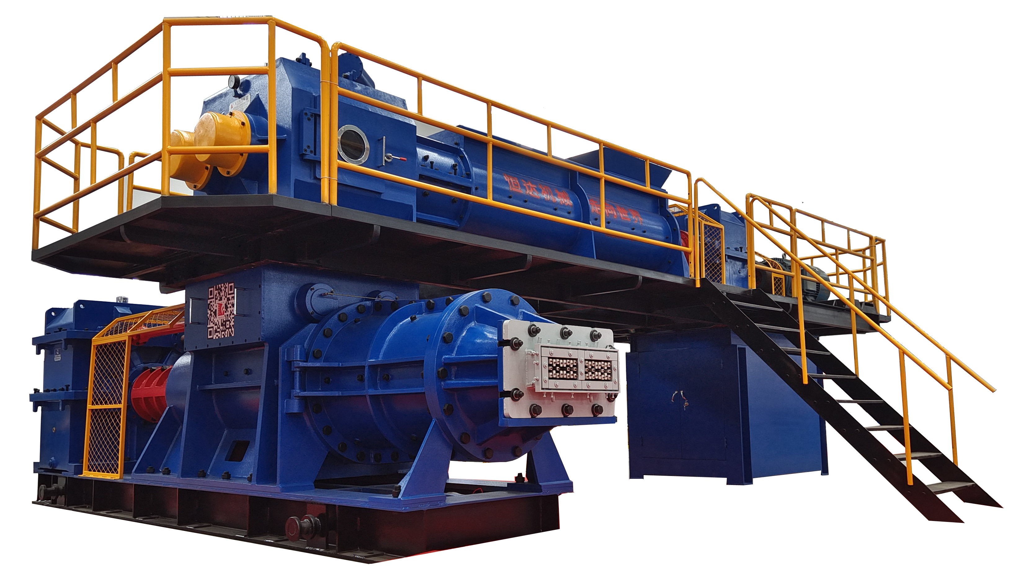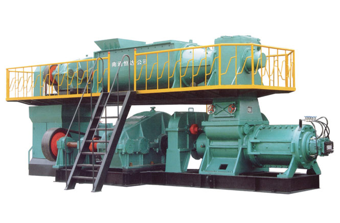 該機(jī)采用上、下級(jí)單獨(dú)傳動(dòng),上級(jí)采用單軸攪拌,箱體采用鋼板焊接,擠出壓力大,適用于高孔洞率,薄壁多孔的頁(yè)巖,煤矸石、粘土磚的硬塑成型。